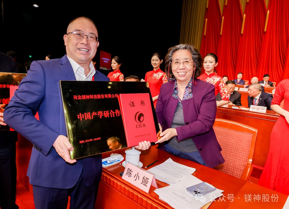3月17日,以“產學研聚焦:新動能、新模式、新產業”為主題的第十五屆中國產學研合作創新大會在北京會議中心隆重召開,河北鎂神科技股份有限公司董事長孫文受邀出席。會議表彰了2023年在產學研深度融合方面做出貢獻的先進單位和個人,河北鎂神科技股份有限公司榮獲“中國產學研合作創新示范企業”,中國產學研合作促進會特聘專家、科技部原副部長陳小婭為我司頒發榮譽證書。